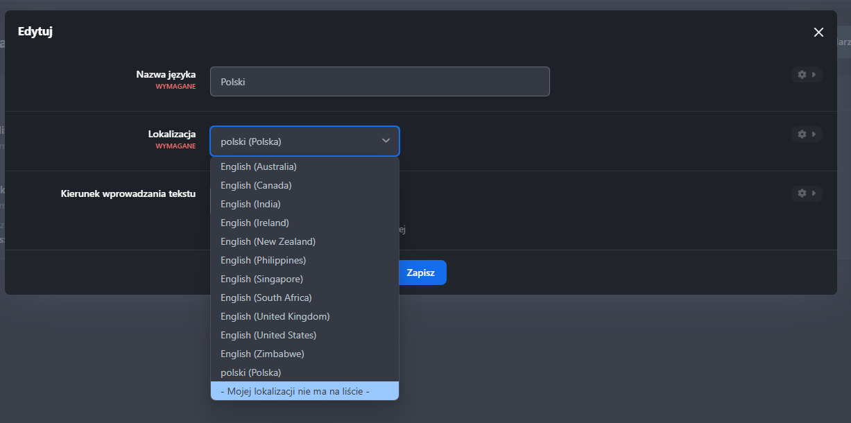 6. Na rozwijanej liście wybierz lokalizację, w naszym przypadku będzie to polski (Polska) lub pl_PL. Jeśli lokalizacji nie ma na liście, trzeba zainstalować locale. Jeśli nie zarządzasz serwerem samodzielnie, zwróć się o pomoc do administratora).