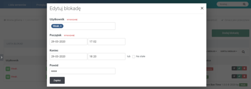- Możliwość edytowania blokady,