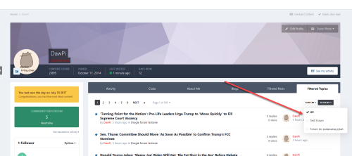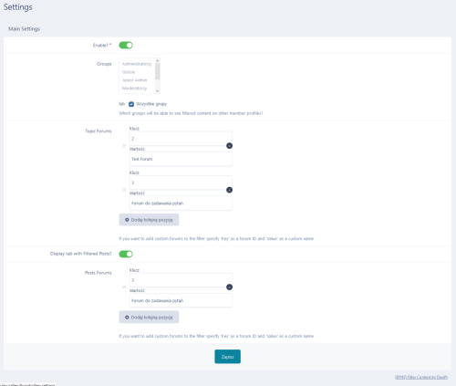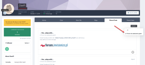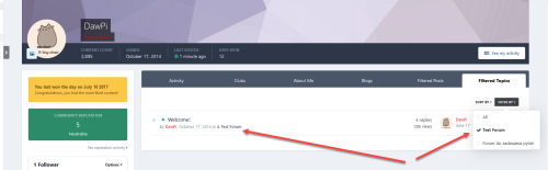 This application will add new tab to the member profile with a clean list of all his topics with the ability to filter them by specified forums in the ACP with custom names. It's useful if original forum has long name or you want to add own name to the filter.