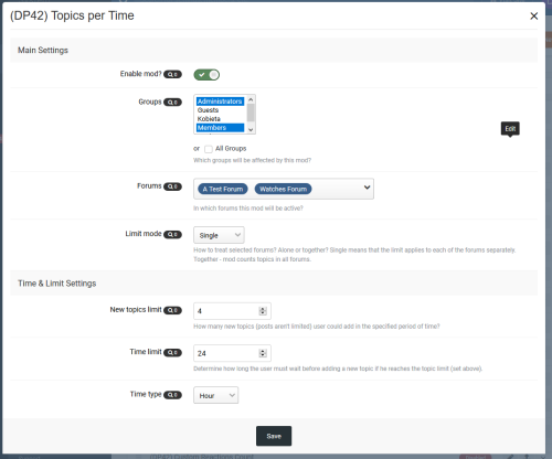 With this plugin you can limit how many topics user will be able to add in specific forum. Two limit modes - single (per forum) or all forums together.
