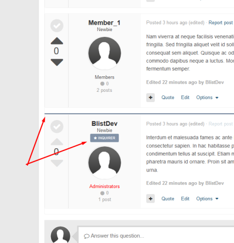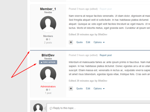 Highlight Topic Author adds a badge and a border above posts and from the author of topics and questions. It will help your commentators to differentiate between other posters and posts from the original author.