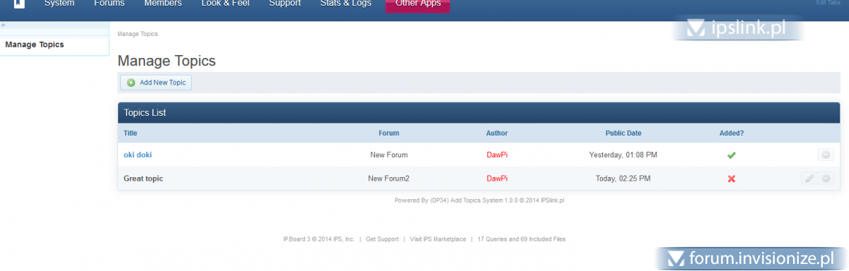 10. Każdy plik w naszej bazie posiada swój własny temat z supportem. Proszę pisać w nim, by nie utrudniać niepotrzebnie życia innym użytkownikom i by gromadzić w jednym miejscu sprawy związane z daną modyfikacją. Popularne modyfikacje/aplikacje: Forum Icons - http://forum.invisionize.pl/topic/28030-dp32-forum-icons/ Mass PM - http://forum.invisionize.pl/topic/4143-dp32-mass-pm/ Top Reputation - http://forum.invisionize.pl/topic/26224-dp32-top-reputation/ Pages - http://forum.invisionize.pl/topic/37532-dp34-pages/ Localize Board - http://forum.invisionize.pl/topic/9740-dp34-localize-board/ iHost - http://forum.invisionize.pl/topic/37054-dp34-ihost/ Jeżeli w powyższych linkach nie ma modyfikacji związanej z tym tematem, a autor nie może odnaleźć prawidłowego w wyszukiwarce - można skontaktować się poprzez prywatną wiadomość na forum z osobą zamykającą temat. Dziękujemy!