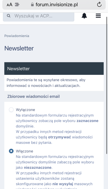 1. Ustawienia powiadomień w ACP - Newsletter i pierwsza opcja: