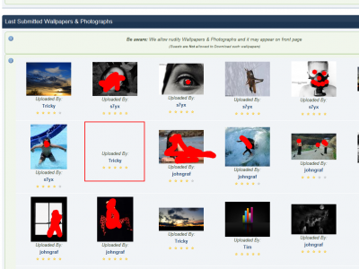 hmm.. forget about the thing above But, i have another question. How can i do like: "i allow nude wallpapers, and i wanna have a "Waring" screenshot on the front page instead of the "nude" wallpapers.. is it possible to make a code who will do that or do i have to "not allow nude walls?