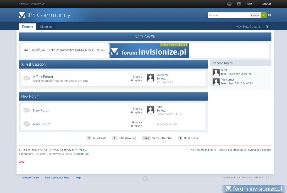 A więc z racji, że na forum pojawiło się już masę pytań o tabelkę sponsorów, postanowiłem przedstawić Wam prosty kod na nią. <!-- TABELA REKLAM --> <h3 class="maintitle"><center>NAGŁÓWEK</center></h3> <div class="ipsBox table_wrap"> <div class="ipsBox_container"> TUTAJ TREŚĆ, ALBO NP WSTAWIONY BANNER W HTML! </div> </div> <!-- KONIEC TABELI REKLAM --> Jeżeli chcesz mieć go na stronie głównej wstaw w ACP Wygląd Twój styl Strona główna boardIndexTemplate na samej górze. Proste? A teraz efekt z zastosowaniem: <!-- TABELA REKLAM --> <h3 class="maintitle"><center>NAGŁÓWEK</center></h3> <div class="ipsBox table_wrap"> <div class="ipsBox_container"> TUTAJ TREŚĆ, ALBO NP WSTAWIONY BANNER W HTML! NP : <img src=http://forum.invisionize.pl/public/style_images/master/logo_default.png> </div> </div> <!-- KONIEC TABELI REKLAM --> Oczywiście działa na wszystkich wersjach IPB, nie tylko na 3.2 oraz nie koniecznie musicie wrzucać do tego tylko bannery. Może odnaleźć zastosowanie jako : Miejsce na reklamy ( google adsense itp ), Miejsce na sponsorów, partnerów, Ogłoszenia, Inne ( to już od Was zależy. ) -
