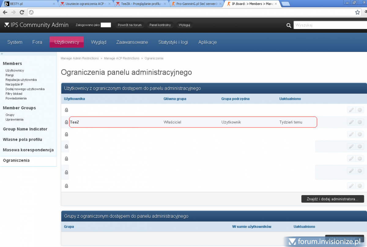 22. Dobra. Poradziłem sobie, na przyszłośc dla kogoś. Tabela w phpmyadmin : `ibf_admin_permission_rows`
