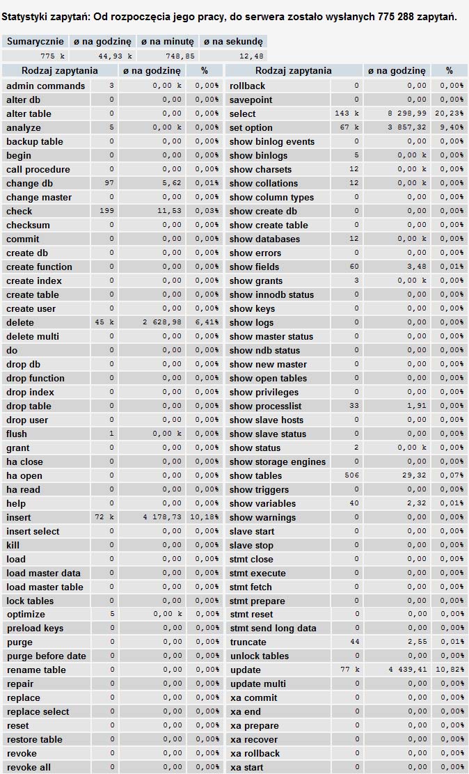 Witam. Od dłuższego czasu borykam się z bardzo dużą ilością zapytań do bazy danych, przez co mam olbrzymie problemy z doborem odpowiedniego serwera. Było kilka hostingów (coraz większe), a obecnie jest dedyk który też nie wyrabia. Forum nie jest jakoś specjalnie rozwinięte żeby po raz kolejny szukać lepszego i większego serwera tym bardziej że jeśli chodzi o miejsce i transfer to zużywam ledwo kilka procent. Poniżej screen z phpmyadmin - są to statystyki od wczoraj od godziny około 21:00 (restart serwera). Powiedzcie mi czy taka ilość zapytań to normalna rzeczy i trzeba się z tym pogodzić, czy może jest gdzieś problem? Statystyki forum: Napisanych postów - 36111 Wszystkich użytkowników -8222 Najwięcej aktywnych - 126
