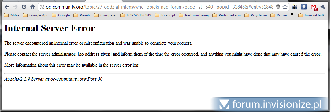 17. Hai, od jakiegoś czasu pojawia się ten błąd: Internal Server Error The server encountered an internal error or misconfiguration and was unable to complete your request. Please contact the server administrator, [no address given] and inform them of the time the error occurred, and anything you might have done that may have caused the error. More information about this error may be available in the server error log. Apache/2.2.9 Server at oc-community.org Port 80 Skrin: Mam pytanie, czy ma ktoś pojęcie, why? Mam pytać dostawcę co jest? Może holdera domeny? Domenę mamy gdzie indziej i po DNSach przekierowaną. Może jest jakiś sposób z poziomu ACP na rozwiązanie tego?