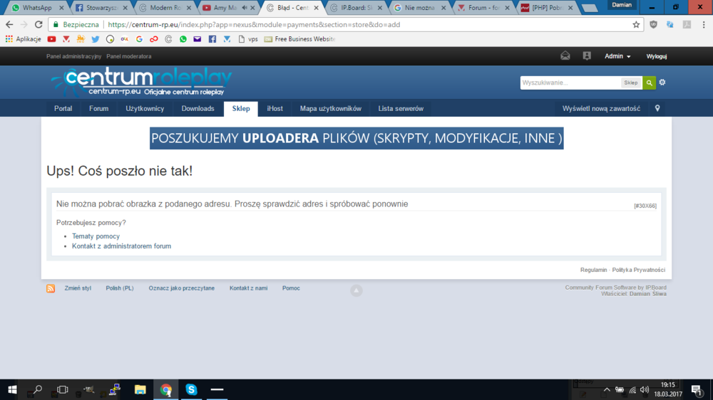 15. Tak- to nexus. Jako "klient" próbuję zupladować grafikę (jako pakiet reklam) do zakupu o konkretnych wymiarach (określonych w ustawieniach)- banerki. No i wpisuje adres docelowy (hiperłącze) i wciskam KONTYNNUJ i wywala taki błąd. Co dziwne, spróbowałem zalogować się na innego użytkownika- udało się raz, chciałem proces potwórzyć- już się nie udało, na innym testowym użytkowniku również nie. Tak jakby skrypt miał foszki