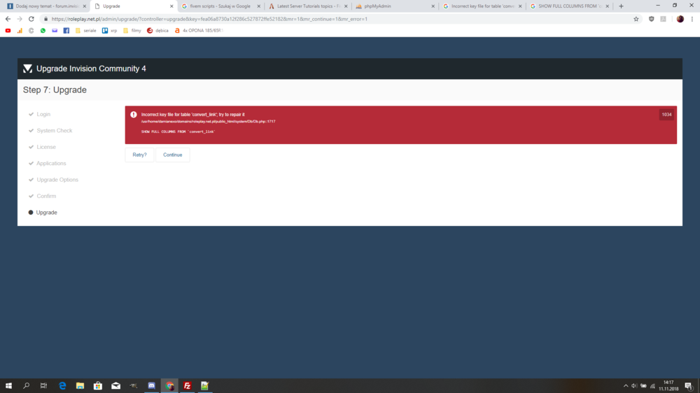 9. Wszystko fajnie, pozamieniałem pliki, porobiłem co potrzeba i tu takie coś. Co oznacza ten błąd? W google w wynikach z IPS/IPB nic nie znalazłem ani guzik "restry?" ani "continue" nie działa- w sensie klikne ale dalej to sie włączy PS. Próbowałem naprawić tabelę