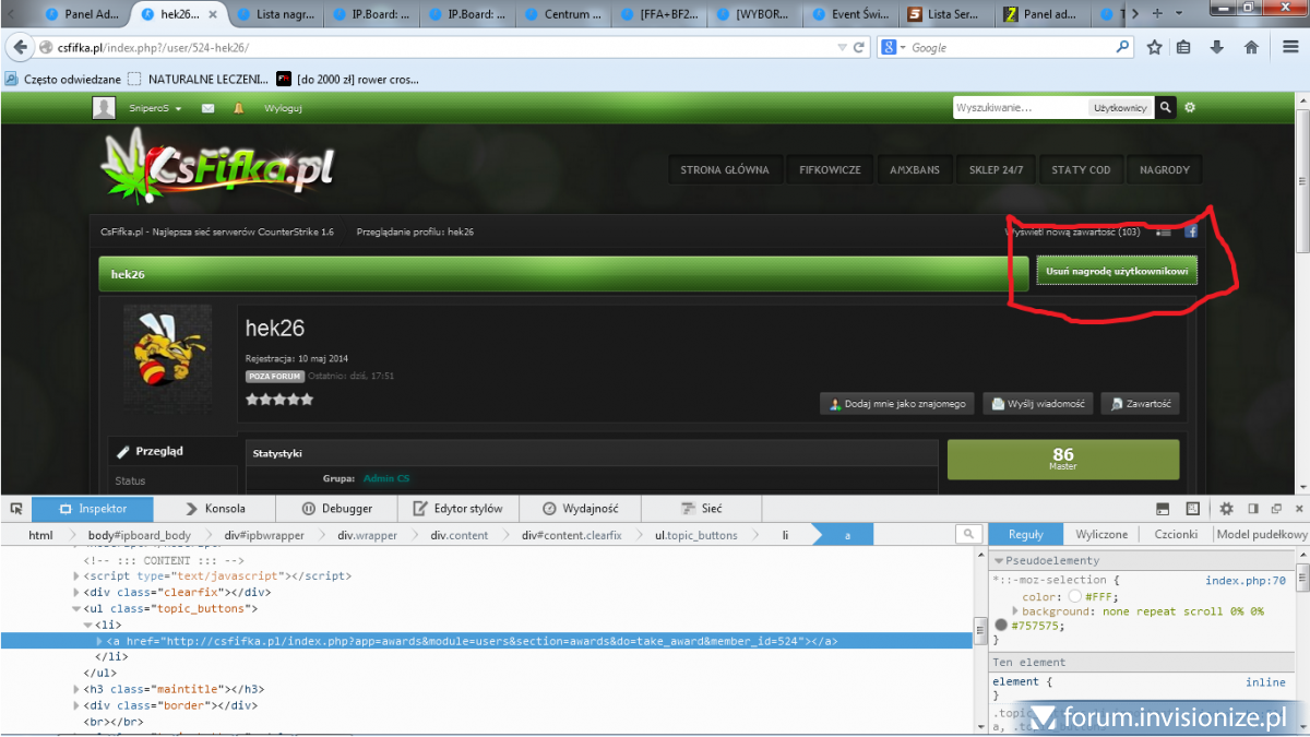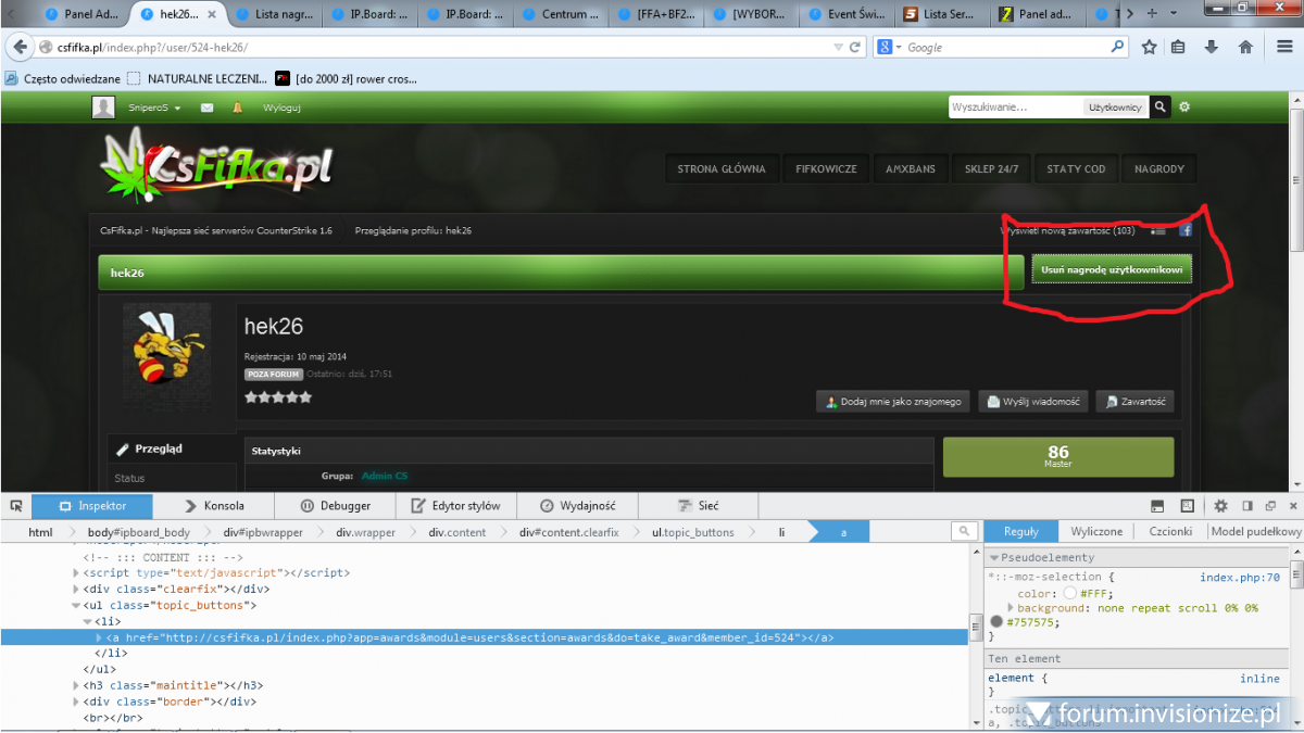 No właśnie nie pomyślał i nie dodał. Są też inne opcje które widzą tylko administratorzy np "Nagroda UŻytkownika" do przyznawania nagród. Najlepiej byłoby przekopiować sprawdzanie z tego buttona "Nagroda UŻytkownika" na usuwanie nagród. Jest gdzies jakiś tutek jak zmienić kawałek modyfikacji? -