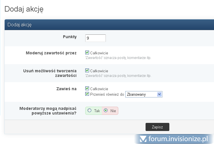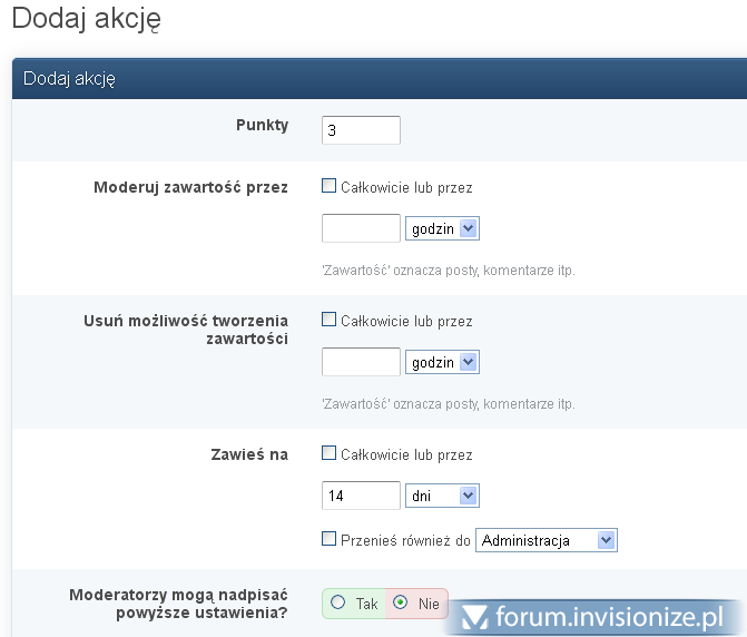 10. No coś Ty. Gdy zawieszasz Użytkownika to go do żadnej grupy nie przenoś, bo zawieszasz tylko na określony czas który definiujesz w akcjach. Przecież po odwieszeniu, Użytkownik ma wrócić do swojej grupy w której wcześniej się znajdował. Kara minie, system odwiesi Użytkownika, ten znowu normalnie funkcjonuje. Z kolei gdy banujesz, to na stałe. Nie banuje się konta od- do, przecież. Jeżeli więc banujesz, to określ grupę "zbanowany" do której Użytkownik ma zostać przeniesiony, gdy nałapie odpowiednią ilość punktów karnych. I rozróżnij te dwie rzeczy "Zawieszony" to co innego niż "zbanowany".