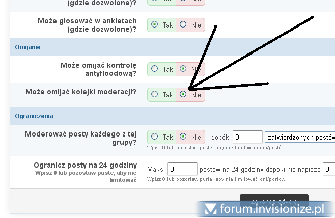 12. Na domyślnym szablonie próbowałeś? Może by tak w profilu uzupełnić adres forum? Przydałoby się przy udzielaniu pomocy. I jeszcze takie pytanie, kiedy to odkryłeś że tak się dzieje? Czy wcześniej było dobrze, czy tego nie wiesz bo nie używałeś tej opcji? Czy jesteś pewny że Użytkownicy wszystkich niepowołanych grup mogą zobaczyć ten post? Czy w ACP-->Użytkownicy-->Grupy, zakładka "Forum" nie masz przypadkiem włączonego omijania moderacji dla tych grup, które mogą tam wejść? Czy sprawdzałeś te ustawienia dla wszystkich grup? Tutaj screen: i wreszcie, czy nie masz zainstalowanego jakiegoś dodatku który wpływa na moderację tematów i postów a może być nie aktualny w Twojej wersji skryptu, lub niedopracowany na tyle że kłóci się z ustawieniami forum?