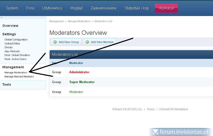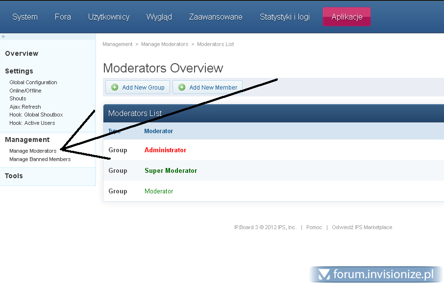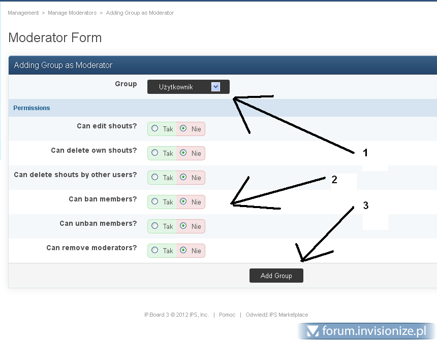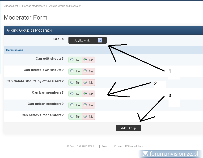 Witaj. Skieruj się do ACP-->Shoutbox-->Manage Moderators: Dodaj nową grupę przyciskiem "Add New Group" i wskaż grupy (Najczęściej Super Moderator i Moderator) Wybierz stosowną grupę (1) nadaj uprawnienia (2) Zapisz (3) Pozdrawiam -
