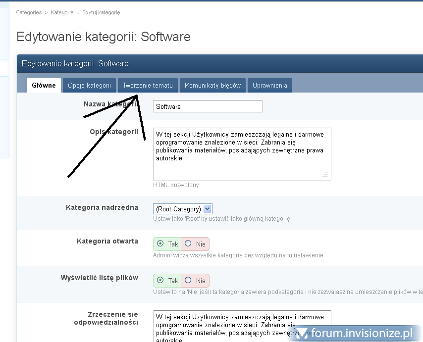 19. Trzykrotnie powiadasz Ale do KATEGORII download nie zajrzałeś. A właśnie tam, się konfiguruje temat. Oto: Dodatkowo Ci powiem przy okazji, że na Marketplace jest wtyczka, która informuje na Shoutboxie o nowym pliku z działu download. Nie wiem czy to przypadkiem nie wystarczy. Po co cały nowy topik, skoro i tak jest support dotyczący kazdego pliku od razu przy pliku (jako temat dotyczący tego pliku). Więc czy potrzebne jest masło maślane, oto jest pytanie.