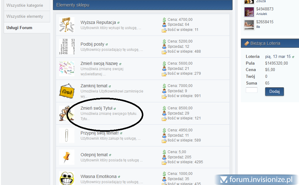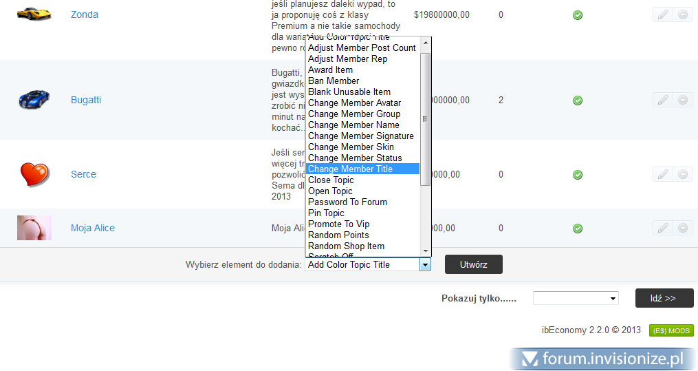 Z pomocą Ci przyjść może aplikacja ibEconomy Points System. Nie wiem tylko czy ma sens istalować taki duży dodatek, jesli chodzi Ci wyłacznie o zmianę tytułu dla określonej grupy. Jednak ibEconomy, posiada możliwość ustawienia konkretnych iTems, które mogą być"kupowane" w zamian za punkty przez wszystkie, lub OKREŚLONE grupy. Jedną z opcji jest możliwość "zakupienia" zmiany własnego tytułu. Dam Ci kilka screenów z mojego serwisu i z ACP: Po stronie forum: I po stronie ACP. Opcja zmiany tytułu, to jedna z domyślnych w ibEconomy. Posiada też mnóstwo innych dodatków.: Możesz więc do tematu podejść "kompleksowo" i zaoferować swoim Userom coś więcej. Uprzedzam Cię jednak, że konfiguracja tego molocha jest dosyć skomplikowana i wymaga czasu. Możesz dojśc do tego, że np Userzy danej grupy, np VIP, mogą nabyć określone Items za symboliczną "kwotę" (u mnie waluta nazywa się "zdradki bo tak ją sobie nazwałem a zdobywa się ją poprzez pisanie postów na forum lub jako wygrana w loterii która też jest częścią ibEconomy), a inne grupy, mają np "zaporową" cenę za ten sam items, lub w ogóle nie mogą go kupić bo nie posiadają uprawnień. Pozdrawiam, Sem -