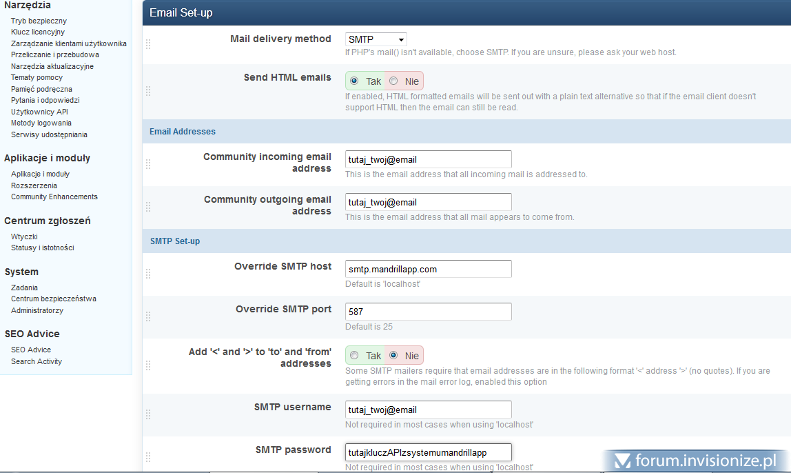 Z tego co widzę, to wszystkie opcje forum, gdzie wraz z publikacją JAKIEJŚ zawartości, jednocześnie wysyłane jest powiadomienie email,- to własnie wysyłka email powoduje problemy, stąd długi czas oczekiwania. Więc, nie tyle wina hostingu, co serwera pocztowego na tym hostingu. Jak masz skonfigurowaną opcję: Ustawienia > System > Email Set-up ? Czy korzystasz z wbudowanego PHP Mail()? Jeśli tak, najprostszym rozwiązaniem które powininno załatwić Twój problem będzie: Zarejestruj się na https://www.mandrill.com/ zajmie Ci to 20 sekund. Potem wygeneruj dla siebie klucz API jako hasło do połaczenia SMTP. A potem skonfiguruj opcję email settings, tak: Co chyba oczywiste, wpisz w swój adres email i swój klucz API uzyskany z mandrill jako hasło. Reszta ma być skonfigurowana tak samo. Tym sposobem, ominiesz serwer poczty swojego usługodawcy i zyskasz szybkie połaczenie SMTP z dedykowanym serwerem poczty. Polecam takie rozwiązanie. Spróbuj i napisz w tym temacie, czy to rozwiązało problem. Pozdrawiam, Sem