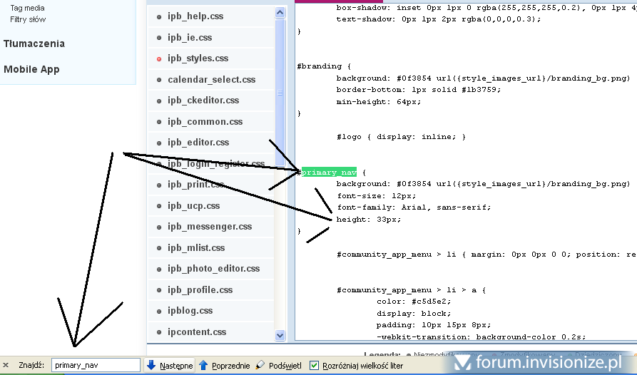 18. No to lecisz. Włączasz forum za pomocą cywilizowanej przeglądarki Firefox. No i : Scr1: i potem: i myślisz sobie, aha już wiem. Więc lecisz dalej w ACP do stylu i przełączasz na zakładkę CSS: Więc w wyszukiwarce już wiesz jaką frazę masz wpisać. Więc ją wpisujesz przy otwartym stylu i? I wszystko jasne. tutaj definiujesz kolor, grubość i inne detale. Akurat wyrażeń primary_nav jest więcej, zatem znajdź i edytuj wszystkie odpowiednio. Musisz też zbadać i pozmniejszać pozostałe elementy paska, na przykład przyciski, w przeciwnym razie, przyciski nie będą się mieścić na pomniejszonym pasku nawigacji. Ale teraz już wiesz jak to zrobić, więc sobie radź WSZYSTKO masz w tym, CSS.