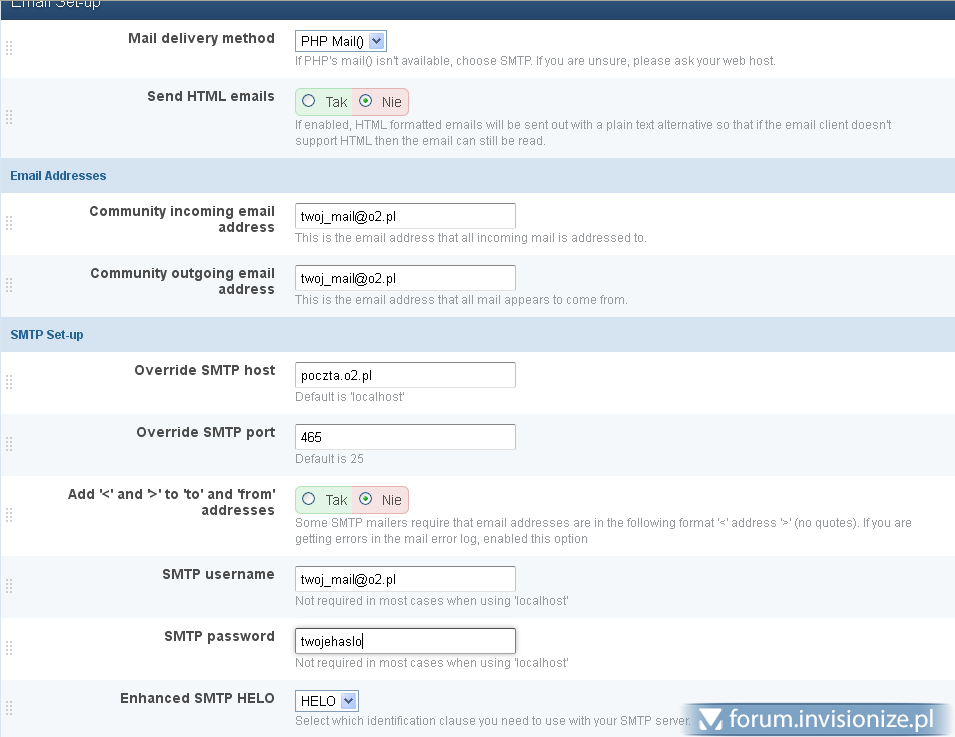 1. Od zawsze używam o2 dla poczty wychodzącej SMTP i nigdy nie miałem żadnego problemu nawet przy bardzo dużej ilości subskrypcji. Opcja z o2 jest najlepsza o czym przekonałem się. Z interii nie skorzystasz z wp, nie skorzystasz, gmail jest kłopotliwy. Radzę więc o2 i skonfiguruj to sobie w następujący sposób (Oczywiście w miejscu "twoj_mail" to sobie wpisz własny, założony na potrzebę forum a zamiast "twojehaslo" to podaj hasło które wymyśliłeś podczas zakładania tegoż maila na o2. Resztę wypełnij tak samo jak na screenie. Więc: ACP-->Ustawienia--> Email Set Up: (Kliknij by powiększyć) Dlatego dobrze jest skonfigurować SMTP, bo często usługodawcy hostingu, limitują ilość wysyłanych maili ze swojego hosta jeżeli to jest zwykła usługa hostingu. A tym bardziej, jeśli masz tylu ludzi. Każdy coś tam sobie zasubskrybuje i się może okazać, że wysyłasz 4 tysiące maili na dobę nawet o tym nie wiedząc, a limit masz na przykład dwa tysiące. Forum bez powiadomień, po prostu LEŻY. A w przypadku tej konfiguracji, to zwyczajnie "zwalasz" cały ruch email na zasobne serwery poczty o2, dla których taki przemiał to jest pestka, dodatkowo te serwery nie są nigdzie banowane. Gdy korzystasz z wbudowanej funkcji mail() to ten mail (lub może bardziej IP serwera) szybko może zostać zakwalifikowane jako spamer, głównie przez serwisy Onetu i Interii, które szybko banują "maluczkich". Jeśli tak się stanie, to Twoje powiadomienia nawet jeśli dobrze jest skonfigurowana poczta, to po prostu przestaną docierać. Wybierz więc SMTP na o2.