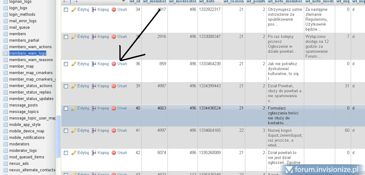 Jurij, ale w wersji 3.3.3 juz się tak nie da. Przez bazę danych, możesz usuwać warny. Tabela members_warn_logs Oto przykład: Wybierasz sobie którego warna chcesz usunąć. Po tej operacji, znika z Panelu Moderatora (Logi ostrzeżeń, które zostają tam nawet gdy ostrzeżenie wygaśnie) Z poziomu Bazy, możesz usunąć ostrzeżenie które wygasło, lub podczas jego trwania, pytanie tylko PO CO, skoro samo wygaśnie przy poprawnie skonfigurowanych "powodach" i "akcjach". Ale po usunięciu tego loga, możesz też w ACP edytować Użytkownika i wyzerować mu licznik warnów. Jeśli zrobisz i jedno i drugie, to wtedy jest tak, jakby nigdy warna nie było. Wiem że po konwersji czasem nie jest dobrze, bo są warny w bazie a nie ma ich w widoku Użytkownika lub na odwrót. Wszystko załatwi ta jedna tabela, więc obczaj ją sobie. Na Twoje drugie pytanie, znajdziesz rozwiązanie w ACP "powody" i "acke". Nie dalej jak dwa dni temu, pisałem bardzo obszerny post na ten temat przy okazji tematu o tym, jak wyłaczyć funkcję "other" S- Moderatorom. Pozdrawiam. -