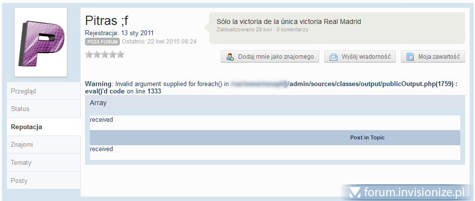 7. Witam, mam niemały problem z po aktualizacji. Nie mogę sobie poradzić z systemem reputacji po aktualizacji. Niby da się normalnie rozdawać "plusiki" jednak po wejściu na profil - tab Reputacja pokazuje się błąd pliku php: Warning: Invalid argument supplied for foreach() in (ścieżka)/admin/sources/classes/output/publicOutput.php(1759) : eval()'d code on line 1333 if ( $this->loaded_templates[ $skin_global_name ] == "" and $name != 'skin_global' AND $this->_noLoadGlobal === FALSE ) { //----------------------------------------- // Skin global not loaded... //----------------------------------------- $this->DB->build( array( 'select' => '*', 'from' => 'skin_cache', 'where' => "cache_set_id=".$id." AND cache_value_1 IN ('skin_global', '$name')" ) ); $this->DB->execute(); while ( $r = $this->DB->fetch() ) { if ( $r['cache_value_1'] == 'skin_global' ) { $skin_global = $r['cache_content']; } else { $other_skin = $r['cache_content']; } } if ( empty( $new_skin_global_name ) OR ! class_exists( $new_skin_global_name ) ) { eval($skin_global); } $new_skin_global_name = $this->_getSkinHooks( 'skin_global', $skin_global_name, $id ); $this->compiled_templates['skin_global'] = new $new_skin_global_name( $this->registry ); # Add to loaded templates $this->loaded_templates[ $skin_global_name ] = $new_skin_global_name; } else { //----------------------------------------- // Skin global is loaded.. //----------------------------------------- if ( $name == 'skin_global' and in_array( $skin_global_name, $this->loaded_templates ) ) { return; } //----------------------------------------- // Load the skin, man //----------------------------------------- $template = $this->DB->buildAndFetch( array( 'select' => '*', 'from' => 'skin_cache', 'where' => "cache_set_id=".$id." AND cache_value_1='$name'" ) ); $other_skin = $template['cache_content']; } eval($other_skin); if ( $name == 'skin_global' ) { $new_skin_global_name = $this->_getSkinHooks( 'skin_global', $skin_global_name, $id ); $this->compiled_templates['skin_global'] = new $new_skin_global_name( $this->registry ); # Add to loaded templates $this->loaded_templates[ $skin_global_name ] = $new_skin_global_name; } else { $new_full_name = $this->_getSkinHooks( $name, $full_name, $id ); if( class_exists( $new_full_name ) ) { $this->compiled_templates[ $name ] = new $new_full_name( $this->registry ); # Add to loaded templates $this->loaded_templates[ $full_name ] = $new_full_name; } } Całość wygląda na stępująco jak na obrazku :-) Szukałem ustawień / zmieniałem sytem reput na polubienia ale widocznie działa to dokładnie tak samo jako reputacja (ograniczenie do plusów) bo błąd dokładnie ten sam. Czy ktoś spotkał się z podobnym problemem? wie albo podejrzewać jak go rozwiazać? Z góry dziękuje! Po przestudiowaniu funkcji eval - wrzucam również wygenerowaną funkcję z linią 1333... function __f__1e4b09f9122ef9266911e0348111ce7d($title, $rows, $pages) { $_ips___x_retval = ''; $__iteratorCount = 0; foreach( $rows as $r ) { $__iteratorCount++; $_ips___x_retval .= " " . (($this->settings['reputation_point_types'] == 'like') ? ("<tr> <td class='short'> <a href='" . $this->registry->getClass('output')->formatUrl( $this->registry->getClass('output')->buildUrl( "showuser={$r['member_id']}", "public",'' ), "{$r['members_seo_name']}", "showuser" ) . "' class='ipsUserPhotoLink'> {$r['member_photo']} </a> </td> <td> " . (($r['member_id'] && $r['members_display_name']) ? (" <a hovercard-ref='member' hovercard-id='{$r['member_id']}' class='_hovertrigger topic_title' href='" . $this->registry->getClass('output')->formatUrl( $this->registry->getClass('output')->buildUrl( "showuser={$r['member_id']}", "public",'' ), "{$r['members_seo_name']}", "showuser" ) . "' title=''>{$r['members_display_name']}</a> ") : (" Guest ")) . " </td> <td>{$r['_date']}</td> <td><a href='" . $this->registry->getClass('output')->formatUrl( $this->registry->getClass('output')->buildUrl( "findpost={$r['pid']}", "public",'' ), "", "" ) . "' title=''>{$r['title']}</a></td> </tr>") : ("<tr> <td class='short'> <a href='" . $this->registry->getClass('output')->formatUrl( $this->registry->getClass('output')->buildUrl( "showuser={$r['member_id']}", "public",'' ), "{$r['members_seo_name']}", "showuser" ) . "' class='ipsUserPhotoLink'> {$r['member_photo']} </a> </td> <td> " . (($r['member_id'] && $r['members_display_name']) ? (" <a hovercard-ref='member' hovercard-id='{$r['member_id']}' class='_hovertrigger topic_title' href='" . $this->registry->getClass('output')->formatUrl( $this->registry->getClass('output')->buildUrl( "showuser={$r['member_id']}", "public",'' ), "{$r['members_seo_name']}", "showuser" ) . "' title=''>{$r['members_display_name']}</a> ") : (" Guest ")) . " </td> <td>{$r['_date']}</td> <td><a href='" . $this->registry->getClass('output')->formatUrl( $this->registry->getClass('output')->buildUrl( "findpost={$r['pid']}", "public",'' ), "", "" ) . "' title=''>{$r['title']}</a></td> <td class='short'><img src='{$this->settings['img_url']}/{$r['_icon']}.png' alt='' /></td> </tr>")) . " "; } $_ips___x_retval .= ''; unset( $__iteratorCount ); return $_ips___x_retval; }