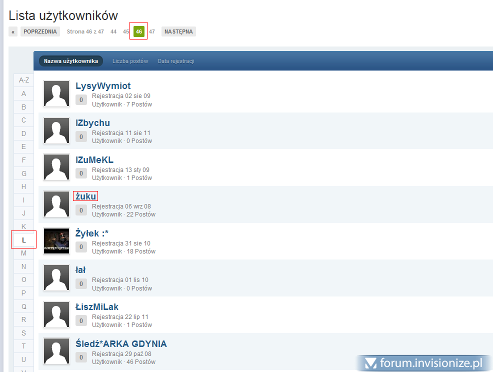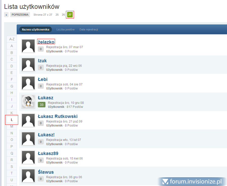 10. Witam, Przypadkowo wpadłem chyba na błąd skryptu... chociaż przez parser nie jest to traktowane jako błąd - wszystko wyświetla się niby tak jak powinno. Problem jednak polega na tym że gdy przeglądamy użytkowników to mamy jakby kategorie A-Z a później każda literka z osobna. Pytanie... jak wyszukać manualnie kogoś kto ma nick "Śledziu", oczywiście zostaje wyszukiwarka - ale powiedzmy że jesteśmy upierdliwi jak warszawiacy i pytamy gdzie oni są... Przypadkowo wlazłem i znalazłem :-) Problem nie występuje tylko na moim forum ale również na invisionize :-) Sprawdzałem czy być może mają oni login na literkę 'L' ale tego nie potwierdziłem. Sprawdzałem na niektórych innych literkach ostatnie strony ale tam jest normalnie... pytanie zatem: W czym literka 'L' jest lepsza? Screeny: