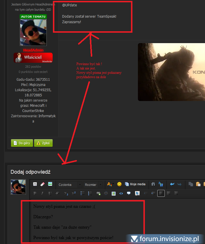Witam, po aktualizacji forum oraz stylu mam pewien problem. Podczas zakładania tematu, czy odpowiedzi w temacie kolor pisma jest (taki jak tutaj) - czarny. Posiadam styl Deflection po aktualizacji tego stylu właśnie pojawił mi się ten błądzik Przedstawiam reszte w załączniku. Od razu mówię, że szukałem dzisiaj prawie połowe dnia po Google i także tutaj, jednak albo nie było do końca odpowiedzi, albo była błędna, albo była poprawna jednak u mnie nie działało ;( Dziękuje za każdą pomoc.