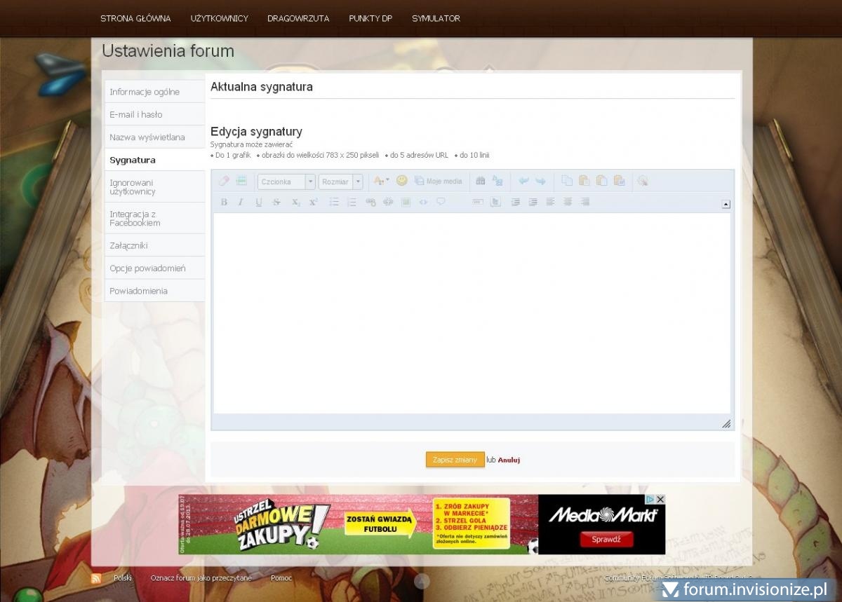 Podczas edycji mojej sygnatury, nie mogę korzystać z paska edytora tekstu. Wygląda jakbym mógł pisać tylko jako czysty HTML tekst. Jak przywrócić pełną sprawność edytora? Zdjęcie w załączniku.