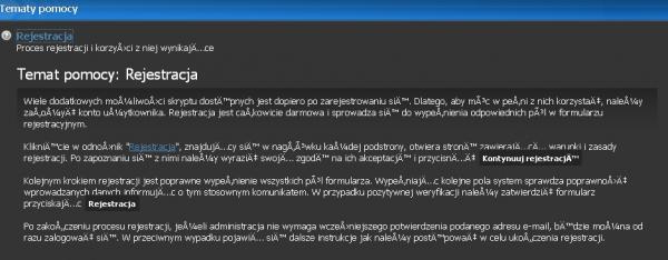 Witam, W sumie nie jestem pewien czy aby na pewno w dobrym dziale napisałem temat ale jakby nie było tyczy się on tłumaczenia. Mianowicie problem jest taki, że na całym forum nie ma problemu z PL znakami, wszystko działa pięknie, ładnie. Natomiast wchodząc na "pomoc" mamy idealny pokaz krzaków. Próba ich poprawy przez panel admina skończyła się tym, że całe tłumaczenie (baza danych została nietknięta i było ok) szlag trafił oraz wszędzie były krzaki. Dopiero wgranie od nowa PL języka uratowało sytuację. Kodowanie forum jest ustawione na UTF-8. Da się coś z tym zrobić?