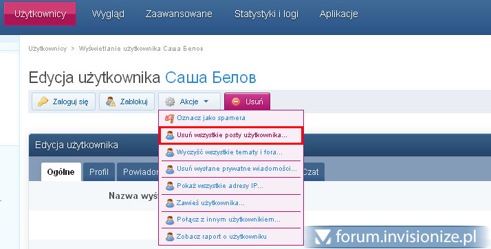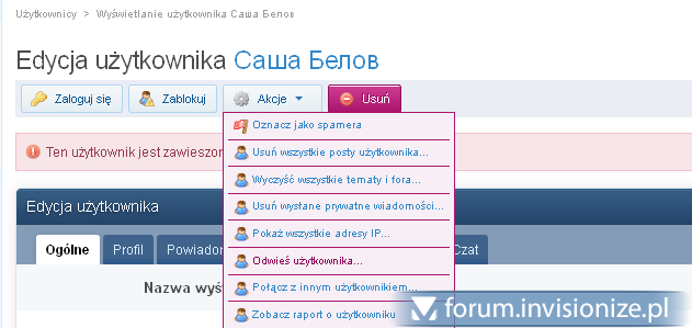 24. No teraz już comprendo. Ale po co ukrywać tę zawartość? Możesz ją usunąć i wtedy wszystkie posty tego użytkownika powinny się znaleźć w panelu moderatora => usunięta zawartość ale nie sprawdzałem tego - musisz sam przetestować. W każdym razie będą niewidoczne dla pozostałych użytkowników
