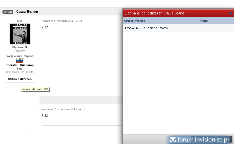 7. Jeżeli mówisz o takiej wersji jak masz w profilu - czyli 3.2.3 - to bzdury piszesz Też mam forum na wersji 3.2.3 i tak wygląda system ostrzeżeń: Najeżdżasz myszką na pasek i wyświetla Ci się ilość % . Klikasz na napis status ostrzeżeń i wyświetla Ci się historia warnów i możliwość zmiany poziomu (akurat znak wodny IZE zakrył tę opcję). Moim zdaniem system warnów IPB jest wystarczająco rozbudowany i nie ma sensu szukać alternatyw