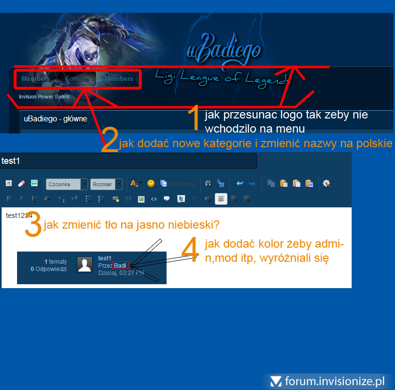 10. Siema forumowicze! mam do was parę pytań. Między innymi, cały czas moje forum funkcjonowało na Php by Przemo, jednak czasy się zmnieniają i już od dawna chciałem spróbować czegoś innego więc postanowiłem założyć nowe forum na IP Board, w sumie zawsze dochodziłem do rozwiązania problemów sam jednak teraz potrzebuje pomocy i mam nadzieje ze mi pomożecie, licze na was więc wszystkie problemy postanowilem umiescic na screenie który widnieje na dole.