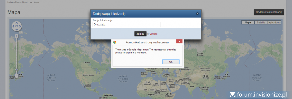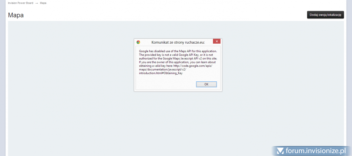 1. Już myślałem, że poradziłem sobie z tym problemem ale niestety nie. Są chwile że mogę dodać lokalizację na mapie, a jak usunę i chcę dodać ponownie to już wyskakuje błąd który jest widoczny na 2 screenie w pierwszym poście. Później po kilku godzinach próbuję znów i jest ok... Myślicie że wina leży po stronie Google czy mojej stronie? Ja zrobiłem wszystko według poradnika którego DawPi podał wyżej: http://forum.invisionize.pl/tutorials/article/40-member-map-konfiguracja-mapy-uzytkownikow/