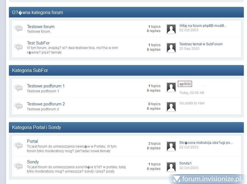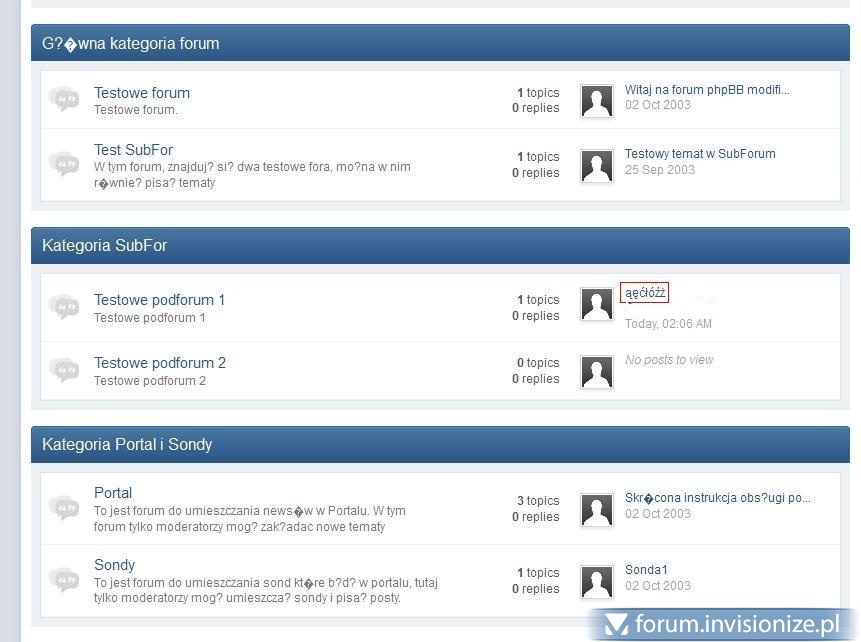 W/w poradnik daje taki sam efekt jak zmiany kodowania w system environment ACP. Po przeprowadzeniu konwersji forum wygląda następująco [czerwonym elementem oznaczyłem temat napisany po konwersji, w którym polskie znaki są prawidłowe]: Zmiana na latin1 lub utf8 w w/w sposobie daje taki efekt: Oczywiście ciągle pracuję na przemo świeżo po instalacji jak opisałem w 1-szym poście. -