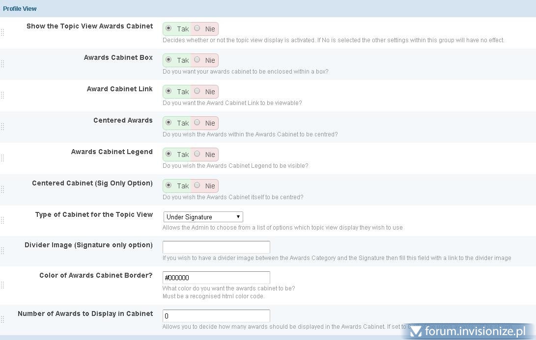 Oczywiście zaznaczam, że instalacja przebiegła pomyślnie. Jak widać na poniższym screen'ie ustawienia są aby pokazywało medale. Dodatkowo przez to nie mogę skorzystać z opcji De-Award User ponieważ na wybranym user'ze nie pokazuje żadnych medali do zabrania. -