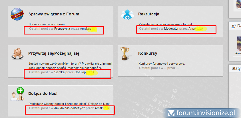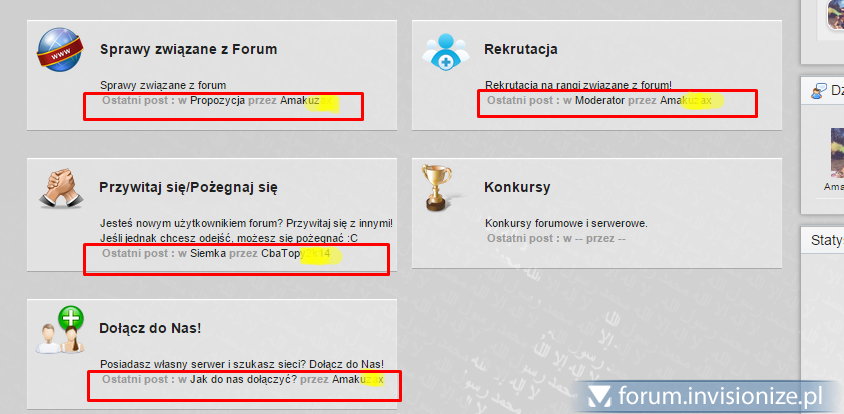 3. OK, mam znalazłem to ręcznie w boardIndexTemplate <!-- last post --> <ul class='board-last_post' style='margin-bottom: 5px;'> <if test="hideLastInfo:|:$forum_data['hide_last_info']"> <span class='last_post_info' >{$this->lang->words['last_post_info']}: {$this->lang->words['f_protected']}</span> <else /> <span class='last_post_info' > <strong>{$this->lang->words['last_post_info']} : {$this->lang->words['in']}</strong> {$forum_data['last_topic_title']} <strong>{$this->lang->words['by']}</strong> <if test="lastPosterName:|:isset($forum_data['last_poster_name']) AND $forum_data['last_poster_name']"> <if test="lastPosterID:|:$forum_data['last_poster_id']"> <a href='{parse url="showuser={$forum_data['last_poster_id']}" template="showuser" seotitle="{$forum_data['seo_last_name']}" base="public"}' title='{$this->lang->words['view_profile']}'>{$forum_data['last_poster_name']}</a>{parse template="user_popup" group="global" params="$forum_data['last_poster_id'], $forum_data['seo_last_name']"} <else /> {$this->settings['guest_name_pre']}{$forum_data['last_poster_name']}{$this->settings['guest_name_suf']} </if> <else /> {$this->lang->words['f_none']} </if> </if> </span> </ul> <!-- end last post --> Czy ktoś mógłby mi pomóc z przerobieniem tego kodu, tak aby nazwa była np pogrubiona(najlepiej jakiś fajny efekt tekstu, nie wiem dajmy na to a nazwa użytkownika była koloru grupy do której należy?