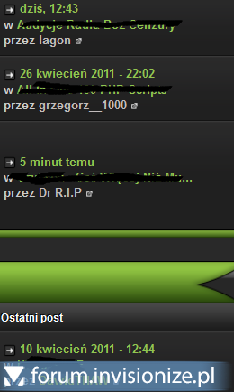 17. Witam, Modyfikacja działa poprawnie, lecz z dania na dzień, w 1 tylko kategorii w widoku forum, nie koloruje nazw użytkownika. W innych kategoriach tak. Jeśli wejdziemy w jakieś forum i spojrzymy tam na listę subfor tak są kolory. Eh zagmatwane. W widoku forum nie ma kolorów w 1 tylko kategorii, a wszędzie indziej są. Gdzież może leżeć problem? Znak wodny zasłania, ale tam użytkownik jest właściwie pokolorowany.