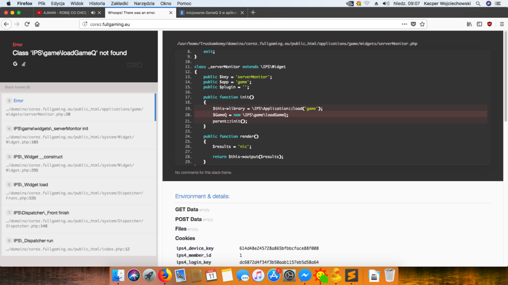 Witam, mam problem odnośnie skryptu GameQ 3. Próbuję go zainicjować do mojej aplikacji stworzonej dla Invision Community 4.2, lecz mam błąd Class 'IPS\game\loadGameQ' not found . Wzorowałem się na Server List. Mój kod: /applications/game/sources/loadGameQ.php: <?php namespace IPS\game; if(!defined('\IPS\SUITE_UNIQUE_KEY')) { header((isset($_SERVER['SERVER_PROTOCOL']) ? $_SERVER['SERVER_PROTOCOL'] : 'HTTP/1.0').' 403 Forbidden'); exit; } class _loadGameQ { public function __construct() { require_once str_replace('loadGameQ', 'GameQ/Autoloader.php', __DIR__); } public function queryGameServer() { try { $servers = [ [ 'type' => 'cs16', 'host' => '145.239.16.78:27015', ], [ 'type' => 'cs16', 'host' => '145.239.16.123:27015', ], [ 'type' => 'teamspeak3', 'host' => '147.135.197.111', 'options' => [ 'query_port' => 10011, ] ] ]; $gq = new \GameQ\GameQ(); $gq->addServers($servers); $gq->setOption('timeout', \IPS\DEFAULT_REQUEST_TIMEOUT); $results = $gq->process(); return $results; } catch(\Exception $exception) { \IPS\Log::log($exception, 'serverlist_query'); } } } /applications/game/widgets/serverMonitor.php <?php namespace IPS\game\widgets; if (!defined('\IPS\SUITE_UNIQUE_KEY')) { header( ( isset( $_SERVER['SERVER_PROTOCOL'] ) ? $_SERVER['SERVER_PROTOCOL'] : 'HTTP/1.0' ) . ' 403 Forbidden' ); exit; } class _serverMonitor extends \IPS\Widget { public $key = 'serverMonitor'; public $app = 'game'; public $plugin = ''; public function init() { $this->library = \IPS\Application::load('game'); parent::init(); $GameQ = new \IPS\game\loadGameQ; } public function render() { $results = 'nic'; return $this->output($results); } }