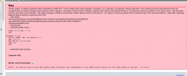 Witam, zaczynam pisać moją pierwszą aplikację w skrypcie IP.Board 3.4.9. Dotychczas korzystałem z MyBB. Mój obecny kod: <?php class CDefault { protected $registry; protected $DB; protected $member; protected $memberData; protected $request; protected $settings; public function __construct( ipsRegistry $registry){ $panelClass = IPSLib::loadLibrary( IPSLib::getAppDir( 'panel' ) . '/sources/panel.php', 'panel' ); $this->panel = new $panelClass($registry); $this->registry = $registry; //$this->DB = $this->registry->DB(); $this->member = $this->registry->member(); $this->memberData = $this->registry->member()->fetchMemberData(); $this->request = $this->registry->fetchRequest(); $this->settings = $this->registry->fetchSettings(); } public function getOutput(){ switch($this->request['go']){ default: { $this->registry->output->addNavigation( "Gracze OnLine" ); require_once(IPSLib::getAppDir( 'panel' ) . '/extensions/samp_api.php'); $query = new SampQueryAPI('80.72.47.182', 3644); if($query->isOnline()){ $aInformation = $query->getInfo(); $aPlayers = $query->getDetailedPlayers(); if($aInformation['players'] != 0){ $counts = 0; $Players = array(); foreach($aPlayers as $sValue){ $gracze[ 'ponline' ][$counts ] = $sValue; $counts++; } $countsx=0; $online.= '<div class="table_wrap"><table class="ipb_table">'; $online.= ' <tbody><tr style="2">'; $online.= ' <td class="row1" align="center" width="15%" > <b>LP.</b> </td>'; $online.= ' <td class="row1" align="center" width="35%" > <b>Nick</b> </td>'; $online.= ' <td class="row1" align="center" width="50%" > <b>Score</b> </td>'; $online.= ' </tr>'; $count_player= array(); $count_player['head'] =0; $count_player['admin']=0; $count_player['jadmin']=0; $count_player['vip']=0; foreach( $gracze['ponline'] as $entry ) { $danekonta = $this->registry->DB('acc')->buildAndFetch( array( 'select' => 'name, uid, premium, score', 'from' => 'Accounts','where' => 'name=\''.$entry['nickname'].'\'')); $this->registry->DB('acc')->execute(); $Players[$countsx]['samp_ID'] = $entry['playerid']; if($danekonta['uid']!=0) { $Players[$countsx]['samp_Respect'] = $danekonta['score']; $Players[$countsx]['samp_Name'] = $entry['nickname']; $Players[$countsx]['samp_Account'] = true; if($danekonta['premium'] == 3) { $Players[$countsx]['samp_Type'] = '#FF8000'; $count_player['head']++;//head } else if($danekonta['premium'] == 2) { $Players[$countsx]['samp_Type'] = '#d40000'; $count_player['admin']++;//admin } else if($danekonta['premium'] == 1) { $Players[$countsx]['samp_Type'] = '#520387'; $count_player['jadmin']++;//jadmin } else if($danekonta['premium'] == 0) { $Players[$countsx]['samp_Type'] = '#124DFF'; $count_player['vip']++; } else $Players[$countsx]['samp_Type'] = '#696969';//gracz } else { $Players[$countsx]['samp_Name'] = $entry['nickname']; $Players[$countsx]['samp_Respect'] = ' - '; $Players[$countsx]['samp_Account'] = false; $Players[$countsx]['samp_Type'] = '#696969'; // bez konta } $countsx++; } foreach($Players as $player) { $url_nick = urlencode($player['samp_Name']); $nick = $player['samp_Account'] ? $player['samp_Name'].' +' : $player['samp_Name']; $online.='<tr align=\'center\'>'; $online.='<td class=\'row1\' width=\'15%\'><b>'.$player['samp_ID'].'</b></td>'; $online.='<td class=\'row1\' width=\'35%\' style=\'text-shadow: 0px 0px 10px '.$player['samp_Type'].'; color: '.$player['samp_Type'].'\'><b>'.$nick.'</b></td> '; $online.='<td class=\'row1\' width=\'50%\'><b>'.$player['samp_Respect'].'</b></td>'; $online.='</tr>'; } $online.= '</tbody></table></div>'; $plr_count = '<span style=" margin-top:-2px;"data-tooltip="Łącznie wszystkich Graczy" class="ipsBadge ipsBadge_grey">'.$aInformation['players'].'</span>( <span style=" margin-top: -2px; background:#FF8000;" data-tooltip="Łącznie wszystkich Head Administratorów" class="ipsBadge"">'.$count_player['head'].'</span> /<span style=" margin-top: -2px; background:#d40000;" data-tooltip="Łącznie wszystkich Administratorów" class="ipsBadge"">'.$count_player['admin'].'</span> /<span style=" margin-top: -2px; background:#520387;" data-tooltip="Łącznie wszystkich Junior Administratorów" class="ipsBadge"">'.$count_player['jadmin'].'</span> /<span style=" margin-top: -2px; background:#124DFF;" data-tooltip="Łącznie wszystkich VIPów" class="ipsBadge"">'.$count_player['vip'].'</span> )'; } else{ $plr_count = "(0)"; $online.= "<center><br/><br/><b>Brak graczy na serwerze! </b></center><br/><br/><br/><br/><br/>"; } } else{ $plr_count = "(0)"; $online.= "<center><br/><br/><b>Brak graczy na serwerze! </b></center><br/><br/><br/><br/><br/>"; } $out='<h3 class="maintitle">Gracze OnLine '.$plr_count.'</h3>'.$online; } } $menuClass = IPSLib::loadLibrary( IPSLib::getAppDir( 'panel' ) . '/sources/menu.php', 'globalMenu' ); $menu = new $menuClass($this->registry); return $menu->getOutput2($out, $this->request['do'], $this->request['go'], array("Gracze OnLine", "Statystyki Serwera","Mapa Świata"), array("online", "statssvr","maps")); } } I jedyne jaki pokazuje się błąd to: Driver Error There appears to be an error with the database.If you are seeing this page, it means there was a problem communicating with our database. Sometimes this error is temporary and will go away when you refresh the page. Sometimes the error will need to be fixed by an administrator before the site will become accessible again. You can try to refresh the page by clicking here ← Return to the index Może ktoś mnie naprowadzić, co źle robię? Zaznaczam, jest to moja pierwsza aplikacja w IPB.