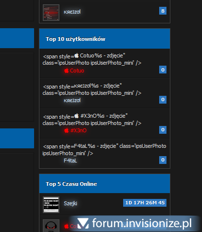 7. Witam, mam problem z hookiem Top X Users. A więc widać kod na stronie głównej: szablon: <div class='ipsSideBlock clearfix' id='topReputationHook'> <h3><img src='{$this->settings['img_url']}/topstar.png' alt='' /> {$this->settings['dp30topx_title']}</h3> <div class='_sbcollapsable'> <ul class='ipsList_withminiphoto'> <if test="topxsreps:|:is_array( $users ) && count( $users )"> {parse striping="topxsreps" classes="row1,row2 altrow"} <foreach loop="topposters_hook:$users as $r"> <li class='clearfix'> <a href='{parse url="showuser={$r['member_id']}" seotitle="{$r['members_seo_name']}" template="showuser" base="public"}' title='{$this->lang->words['view_profile']}' class='ipsUserPhotoLink left'><img src='{$r['pp_mini_photo']}' alt="{$r['members_display_name']}{$this->lang->words['users_photo']}" class='ipsUserPhoto ipsUserPhoto_mini' /></a> <div style="margin-top: 5px;" class='list_content'> {parse template="userHoverCard" group="global" params="$r"} <div class="ipsBadge" style="margin: 0px; padding: 0px 4px; float:right; background:#2C77C2;">{parse format_number="$r['posts']"}</div> </div> </li> </foreach> <else /> <li>{$this->lang->words['dp30topx_no_users']}</li> </if> </ul> </div> </div>