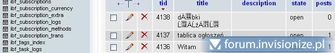 Po przerwaniu walk z kodowaniem wracam na nowo z problemem. Forum 3.1.4 kodowane w iso. Zrzut sql bazy z phpmyadmin'a zrobiony z kodowaniem pliku utf-8 notepad2 twierdzi że plik kodowany jest w utf-8, grzegrzółka również, wszystkie pl-znaczki wygladaja w notepad2 prawidłowo. początek zrzutu wygląda tak SET SQL_MODE="NO_AUTO_VALUE_ON_ZERO"; SET time_zone = "+00:00"; /*!40101 SET @OLD_CHARACTER_SET_CLIENT=@@CHARACTER_SET_CLIENT */; /*!40101 SET @OLD_CHARACTER_SET_RESULTS=@@CHARACTER_SET_RESULTS */; /*!40101 SET @OLD_COLLATION_CONNECTION=@@COLLATION_CONNECTION */; /*!40101 SET NAMES utf8 */; -- -- Baza danych: `n_forum314` -- DROP DATABASE `n_forum314`; CREATE DATABASE `n_forum314` DEFAULT CHARACTER SET latin2 COLLATE latin2_general_ci; USE `n_forum314`; -- -------------------------------------------------------- -- -- Struktura tabeli dla `ibf_admin_login_logs` -- CREATE TABLE IF NOT EXISTS `ibf_admin_login_logs` ( `admin_id` int(10) NOT NULL auto_increment, `admin_ip_address` varchar(16) NOT NULL default '0.0.0.0', `admin_username` varchar(40) NOT NULL default '', `admin_time` int(10) unsigned NOT NULL default '0', `admin_success` int(1) unsigned NOT NULL default '0', `admin_post_details` text, PRIMARY KEY (`admin_id`), KEY `admin_ip_address` (`admin_ip_address`), KEY `admin_time` (`admin_time`) ) ENGINE=MyISAM DEFAULT CHARSET=latin2 AUTO_INCREMENT=2100 ; w pliku zamieniłem wszystkie latin2 na utf8, tak więc mam po zmianach -- Baza danych: `n_forum314` -- DROP DATABASE `n_forum314`; CREATE DATABASE `n_forum314` DEFAULT CHARACTER SET utf8 COLLATE utf8_general_ci; USE `n_forum314`; -- -------------------------------------------------------- -- -- Struktura tabeli dla `ibf_admin_login_logs` -- CREATE TABLE IF NOT EXISTS `ibf_admin_login_logs` ( `admin_id` int(10) NOT NULL auto_increment, `admin_ip_address` varchar(16) NOT NULL default '0.0.0.0', `admin_username` varchar(40) NOT NULL default '', `admin_time` int(10) unsigned NOT NULL default '0', `admin_success` int(1) unsigned NOT NULL default '0', `admin_post_details` text, PRIMARY KEY (`admin_id`), KEY `admin_ip_address` (`admin_ip_address`), KEY `admin_time` (`admin_time`) ) ENGINE=MyISAM DEFAULT CHARSET=utf8 AUTO_INCREMENT=2100 ; wgrywam na serwer przez phpmyadmin, przestawiam w ACP kodowanie na utf8 i d*pa - na forum w postach krzaki. W phpmy admin tekst "tablica ogłoszeń" wygląda przed wgraniem i po wgraniu zmienionego zrzutu tak samo, jak na poniższym obrazku. Nowy temat na forum wyswietla się prawidłowo i a w phpadminie wygląda tak jak ponizej (na forum tytuł tematu to "dębki łążćń" Dlaczego stare posty nie zostały przekonwertowane na utf? -