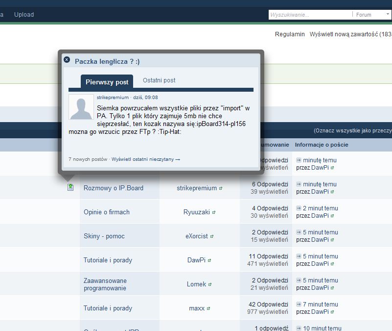 Piszę aplikację (nie php) częsciowo zintegrowaną z IPB. Możliwości API XML-RPC są dla mnie za małe, napisałem większą bibliotekę dostępu do danych dla IPB operująca bezpośrednio na DB. Jej elementem jest m.in. wstawianie nowych postów (wiem że to akurat można zrobić przez api xml, ale jest "ręcznie" dla spójności). Dodaje rekord do tabeli posts, aktualizuje odpowiednie wartości w topics, forums, members [licznik postów]. Problem polega na tym, że posty dodane w ten sposób nie znikają z listy nieczytanych. Podejrzewam że powinienem zrobić jeszcze coś z mechanizmem oznaczania nieczyt. treści, ale nie wiem co dokładnie. Przeglądałem tabelę core_markers_storage i core_markers ale format tych danych mocno zniechęcił mnie do analizowania co się tam dzieje, mam nadzieje że ktoś to może wie