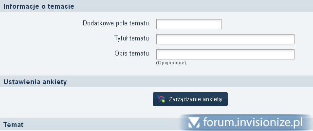 11. Potrzebuję dołożyć extra pole w formularzu tworzenia nowego tematu. Cała zabawa w tym, że chciałbym, aby zawartość tego pola była dołączana do oryginalnej treści tytułu, czyli do tabeli "ibf_topics" w kolumnie "title" Wprawdzie mam aplikację "HSC Topic Template System" ale po pierwsze pracuje ona na oddzielnej tabeli, a po drugie nie dołącza ustawionego pola do tytułu tematu w widoku tematu (co jest dziwne, zważywszy na tytuł aplikacji) Do tego autor odpisał już komuś w wątku supportowym, że nie planuje takiej zmiany :/ Do rzeczy więc: - ze zmianami w skinie poradziłem sobie, poniżej screen. - pytanie w których plikach trzeba dodać "kodu" - wydaje mi się, że w /admin/applications/forums/sources/classes/post/ 1. classPostForms.php 2. classPost.php Może mi ktoś podpowiedzieć, którego kawałka kodu mam się czepić?