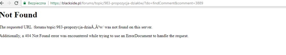 19. Przepraszam ze pisze nowe posty ale nie moge edytowac. Nawet po stworzeniu nowej bazy danych, zaimportowaniu do niej backupu i podpiecie w conf_global tez nie dziala. Naprawianie tabel nie pomaga, nie pokazuje błędów. Moge dziwnie wejsc tylko na strone glowna gdzie mi pokazuje wszystko od chatu, po tematy i uzytkownikow. Ale wejsc w zaden nie moge poniewaz przy logowaniu mi pisze: Not Found The requested URL /login/ was not found on this server. Additionally, a 404 Not Found error was encountered while trying to use an ErrorDocument to handle the request. a przy kazdym temacie: Not Found The requested URL /topic/985-zamkniÄ™tyżegnam-d/ was not found on this server. Additionally, a 404 Not Found error was encountered while trying to use an ErrorDocument to handle the request. Jest jakas rada na to?