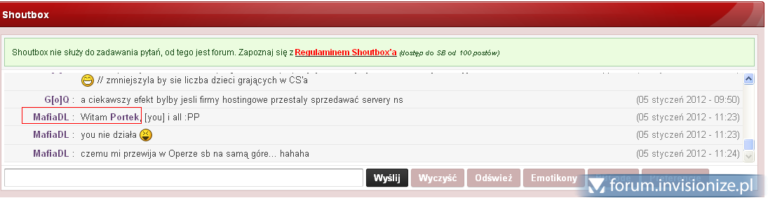 20. Fajna emotka Mistrzu ale jak by u mnie to działało to bym nie pisał tak? U moim Shoutbox 1.2.6 (jakis nowy) tego ni ma : > p.s Demo było dla cb bo masz tam konto : D
