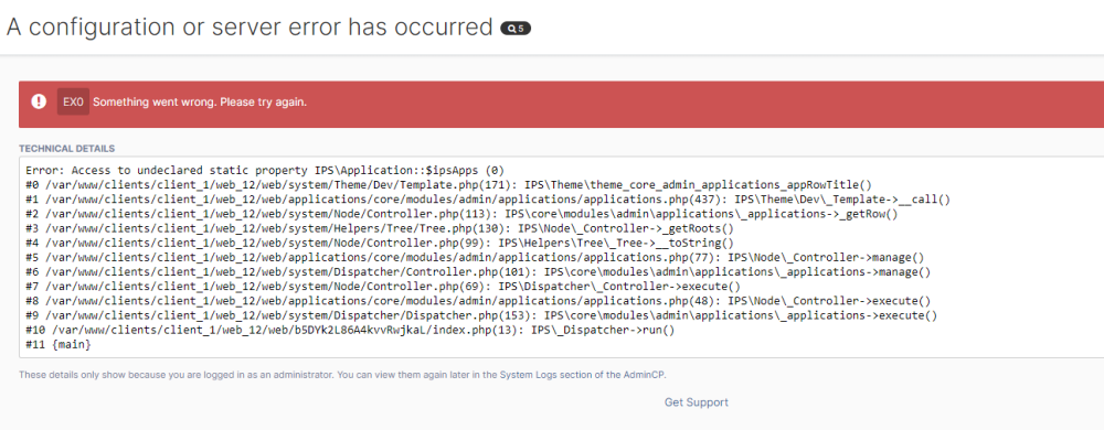 10. Hej, mam problem z IPB4, pobrałem pliki, które miałem zachomikowane z gitlab z IPS4 - stare forum, licencję nadal mam. Po pobraniu i wgraniu bazy wszystko wygląda dobrze ale przy logowaniu czy to do AP czy przez użytkownika jest błąd: EX1054 Nie wiem czym to może być spowodowane, kod jest stary nieaktualizowany, ale dopóki nie sprawdzę co tam jest nie chcę wgrywać aktualizacji. Co oznacza ten błąd? EX1045. Czy jest jakiś tryb debugowania w IPS4, dawno nie używałem nie pamiętam jak to działało. Z góry dzięki.