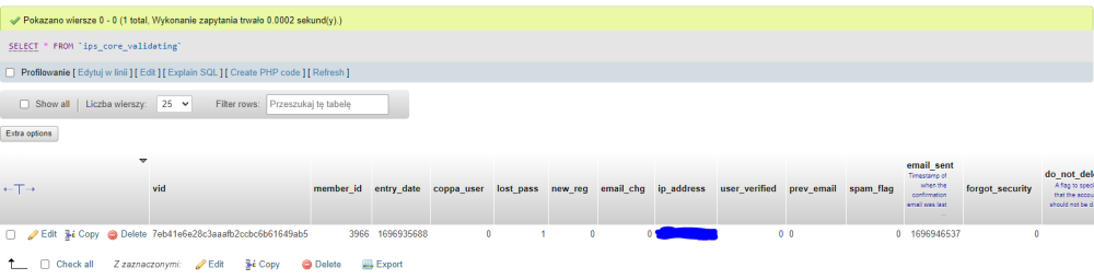 2. Zauważyłem chyba błąd, nie rozumiem tego. Jeżeli jest już wpis, email_sent jest aktualizowany na aktualną datę i token jest ten sam. Natomiast entry_date się nie aktualizuje i wchodząc w ten link mam błąd bo entry_date się nie zmieniło. Natomiast widzę że to zacytowane zapytanie nie ma sprawdzania ani email_sent ani entry_date tylko info czy jest taki vid. I tu nie rozumiem bo: Link: https://mojadomena.com/lostpassword/?do=validate&vid=7eb41e6e28c3aaafb2ccbc6b61649ab5&mid=3966 A błąd ten sam: Gdy wpisu nie ma i jest insert, wszystko wygląda dobrze.