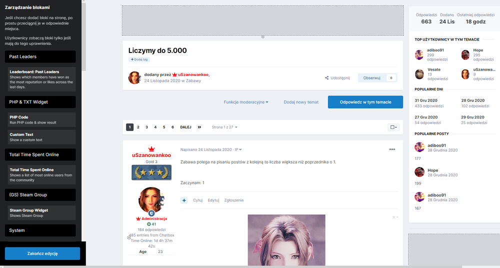 2. Witam, mam problem z dwoma tematami, gdyż nie wiem jak dodałem statystyki danego temat jako panel boczny, co widać na zdjęciu w spoilerze. Problem występuje tylko w dwóch tematach i chciałbym się zapytać Państwa czy istnieje jakiś sposób by to usunąć? Czy będę musiał usunąć temat na swoim forum [pójście na łatwiznę - po za tym to tylko temat zabawy], czy jest możliwość naprawy tego? Dodam, że nie dodałem tego za pomocą "Zarządzania blokami", gdyż sprawdzałem czy w ten sposób nie dałbym rady tego usunąć. Link do tematów: #1 http://upiesela.pl/index.php?/topic/14-liczymy-do-5000/ #2 http://upiesela.pl/index.php?/topic/13-ostatnia-litera/ Wydaje mi się, że błąd występuje tylko w tych dwóch tematach.