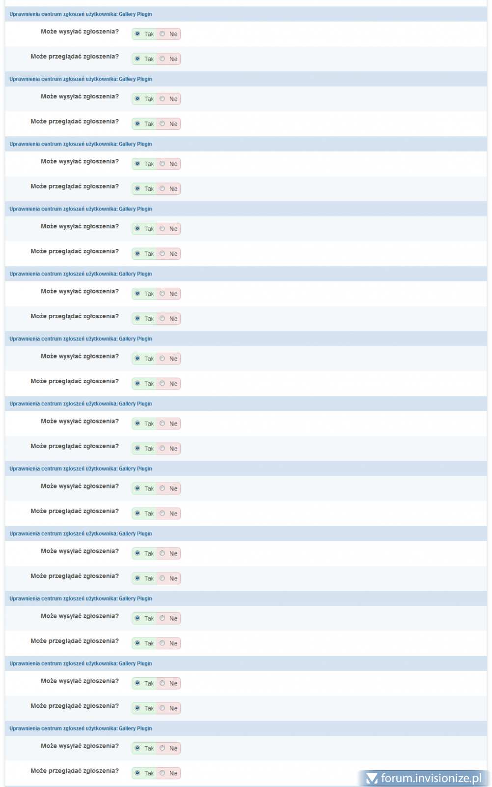 A dokładniej? Mam pokazać kod źródłowy tej zakładki? No okej, proszę: <div id='tab_GROUPS_6_content'> <div> <table class='ipsTable double_pad'> <tr> <th colspan='2' class='head'><strong>Uprawnienia centrum zgłoszeń użytkownika: Blog Plugin</strong></th> </tr> <tr> <td class='field_title'> <strong class='title'>Może wysyłać zgłoszenia?</strong> </td> <td class='field_field'> <span class='yesno_yes '><input type='radio' id='rc_send_8_yes' name='rc_send_8' value='1' checked='checked' /><label for='rc_send_8_yes'>Tak</label></span><span class='yesno_no '><input type='radio' name='rc_send_8' value='0' id='rc_send_8_no' /><label for='rc_send_8_no'>Nie</label></span> </td> </tr> <tr> <td class='field_title'> <strong class='title'>Może przeglądać zgłoszenia?</strong> </td> <td class='field_field'> <span class='yesno_yes '><input type='radio' id='rc_view_8_yes' name='rc_view_8' value='1' checked='checked' /><label for='rc_view_8_yes'>Tak</label></span><span class='yesno_no '><input type='radio' name='rc_view_8' value='0' id='rc_view_8_no' /><label for='rc_view_8_no'>Nie</label></span> </td> </tr> <tr> <th colspan='2' class='head'><strong>Uprawnienia centrum zgłoszeń użytkownika: Forum Plugin</strong></th> </tr> <tr> <td class='field_title'> <strong class='title'>Może wysyłać zgłoszenia?</strong> </td> <td class='field_field'> <span class='yesno_yes '><input type='radio' id='rc_send_2_yes' name='rc_send_2' value='1' checked='checked' /><label for='rc_send_2_yes'>Tak</label></span><span class='yesno_no '><input type='radio' name='rc_send_2' value='0' id='rc_send_2_no' /><label for='rc_send_2_no'>Nie</label></span> </td> </tr> <tr> <td class='field_title'> <strong class='title'>Może przeglądać zgłoszenia?</strong> </td> <td class='field_field'> <span class='yesno_yes '><input type='radio' id='rc_view_2_yes' name='rc_view_2' value='1' checked='checked' /><label for='rc_view_2_yes'>Tak</label></span><span class='yesno_no '><input type='radio' name='rc_view_2' value='0' id='rc_view_2_no' /><label for='rc_view_2_no'>Nie</label></span> </td> </tr> <tr> <th colspan='2' class='head'><strong>Uprawnienia centrum zgłoszeń użytkownika: Gallery Plugin</strong></th> </tr> <tr> <td class='field_title'> <strong class='title'>Może wysyłać zgłoszenia?</strong> </td> <td class='field_field'> <span class='yesno_yes '><input type='radio' id='rc_send_7_yes' name='rc_send_7' value='1' checked='checked' /><label for='rc_send_7_yes'>Tak</label></span><span class='yesno_no '><input type='radio' name='rc_send_7' value='0' id='rc_send_7_no' /><label for='rc_send_7_no'>Nie</label></span> </td> </tr> <tr> <td class='field_title'> <strong class='title'>Może przeglądać zgłoszenia?</strong> </td> <td class='field_field'> <span class='yesno_yes '><input type='radio' id='rc_view_7_yes' name='rc_view_7' value='1' checked='checked' /><label for='rc_view_7_yes'>Tak</label></span><span class='yesno_no '><input type='radio' name='rc_view_7' value='0' id='rc_view_7_no' /><label for='rc_view_7_no'>Nie</label></span> </td> </tr> <tr> <th colspan='2' class='head'><strong>Uprawnienia centrum zgłoszeń użytkownika: Gallery Plugin</strong></th> </tr> <tr> <td class='field_title'> <strong class='title'>Może wysyłać zgłoszenia?</strong> </td> <td class='field_field'> <span class='yesno_yes '><input type='radio' id='rc_send_15_yes' name='rc_send_15' value='1' checked='checked' /><label for='rc_send_15_yes'>Tak</label></span><span class='yesno_no '><input type='radio' name='rc_send_15' value='0' id='rc_send_15_no' /><label for='rc_send_15_no'>Nie</label></span> </td> </tr> <tr> <td class='field_title'> <strong class='title'>Może przeglądać zgłoszenia?</strong> </td> <td class='field_field'> <span class='yesno_yes '><input type='radio' id='rc_view_15_yes' name='rc_view_15' value='1' checked='checked' /><label for='rc_view_15_yes'>Tak</label></span><span class='yesno_no '><input type='radio' name='rc_view_15' value='0' id='rc_view_15_no' /><label for='rc_view_15_no'>Nie</label></span> </td> </tr> <tr> <th colspan='2' class='head'><strong>Uprawnienia centrum zgłoszeń użytkownika: Gallery Plugin</strong></th> </tr> <tr> <td class='field_title'> <strong class='title'>Może wysyłać zgłoszenia?</strong> </td> <td class='field_field'> <span class='yesno_yes '><input type='radio' id='rc_send_16_yes' name='rc_send_16' value='1' checked='checked' /><label for='rc_send_16_yes'>Tak</label></span><span class='yesno_no '><input type='radio' name='rc_send_16' value='0' id='rc_send_16_no' /><label for='rc_send_16_no'>Nie</label></span> </td> </tr> <tr> <td class='field_title'> <strong class='title'>Może przeglądać zgłoszenia?</strong> </td> <td class='field_field'> <span class='yesno_yes '><input type='radio' id='rc_view_16_yes' name='rc_view_16' value='1' checked='checked' /><label for='rc_view_16_yes'>Tak</label></span><span class='yesno_no '><input type='radio' name='rc_view_16' value='0' id='rc_view_16_no' /><label for='rc_view_16_no'>Nie</label></span> </td> </tr> <tr> <th colspan='2' class='head'><strong>Uprawnienia centrum zgłoszeń użytkownika: Gallery Plugin</strong></th> </tr> <tr> <td class='field_title'> <strong class='title'>Może wysyłać zgłoszenia?</strong> </td> <td class='field_field'> <span class='yesno_yes '><input type='radio' id='rc_send_17_yes' name='rc_send_17' value='1' checked='checked' /><label for='rc_send_17_yes'>Tak</label></span><span class='yesno_no '><input type='radio' name='rc_send_17' value='0' id='rc_send_17_no' /><label for='rc_send_17_no'>Nie</label></span> </td> </tr> <tr> <td class='field_title'> <strong class='title'>Może przeglądać zgłoszenia?</strong> </td> <td class='field_field'> <span class='yesno_yes '><input type='radio' id='rc_view_17_yes' name='rc_view_17' value='1' checked='checked' /><label for='rc_view_17_yes'>Tak</label></span><span class='yesno_no '><input type='radio' name='rc_view_17' value='0' id='rc_view_17_no' /><label for='rc_view_17_no'