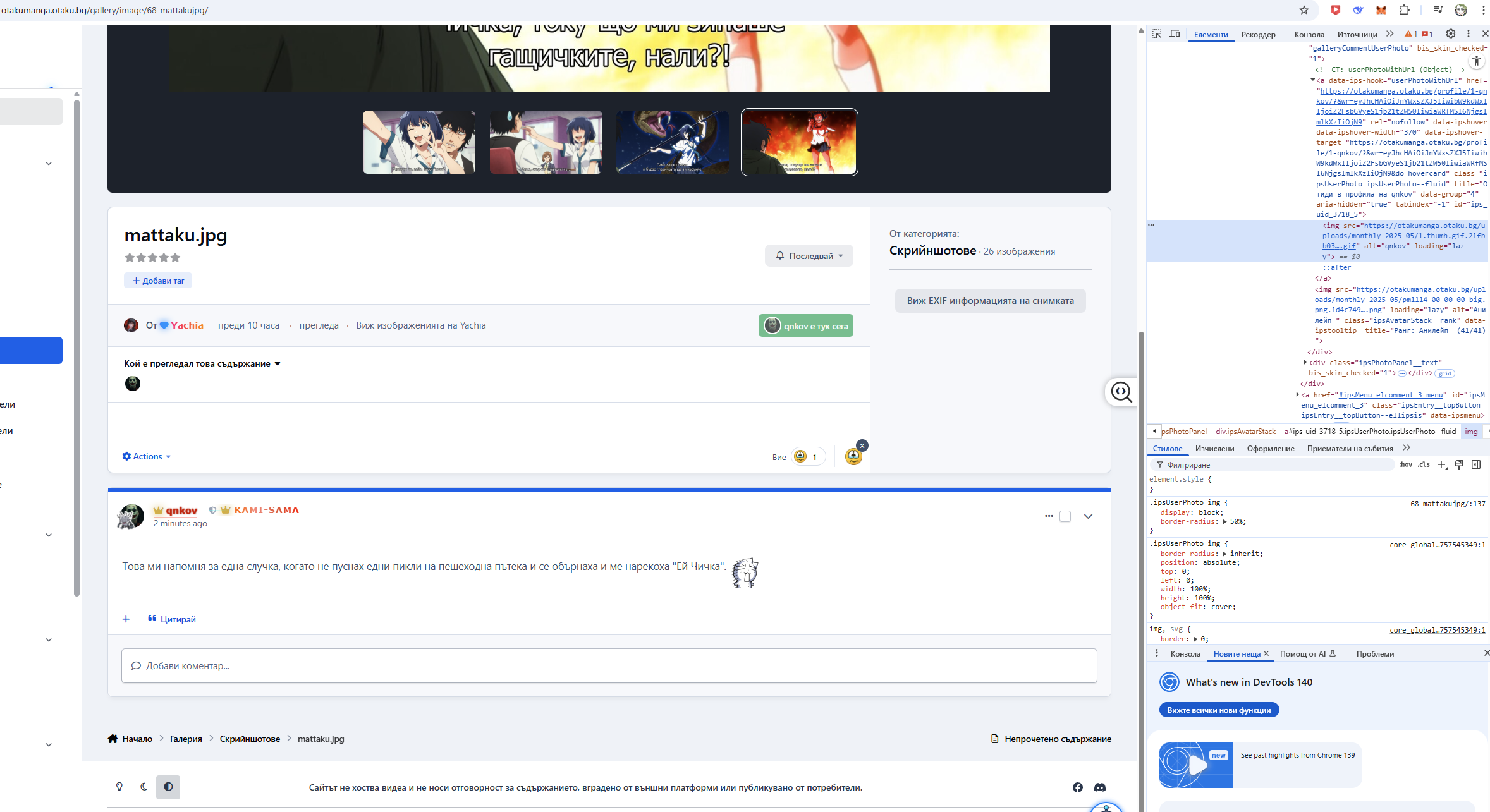 7. I have tried: .galleryCommentPhoto .ipsUserPhoto { width: 100px; height: 100px; } But nothing changes. Maybe the class is the correct. Or .galleryCommentPhoto .ipsUserPhoto { width: 50px; /* задава ширина */ height: 50px; /* задава височина */ object-fit: cover; /* подрязва/центрира снимката, вместо да я разтяга */ border-radius: 5px; /* по избор – заобляне на ъглите */ }
